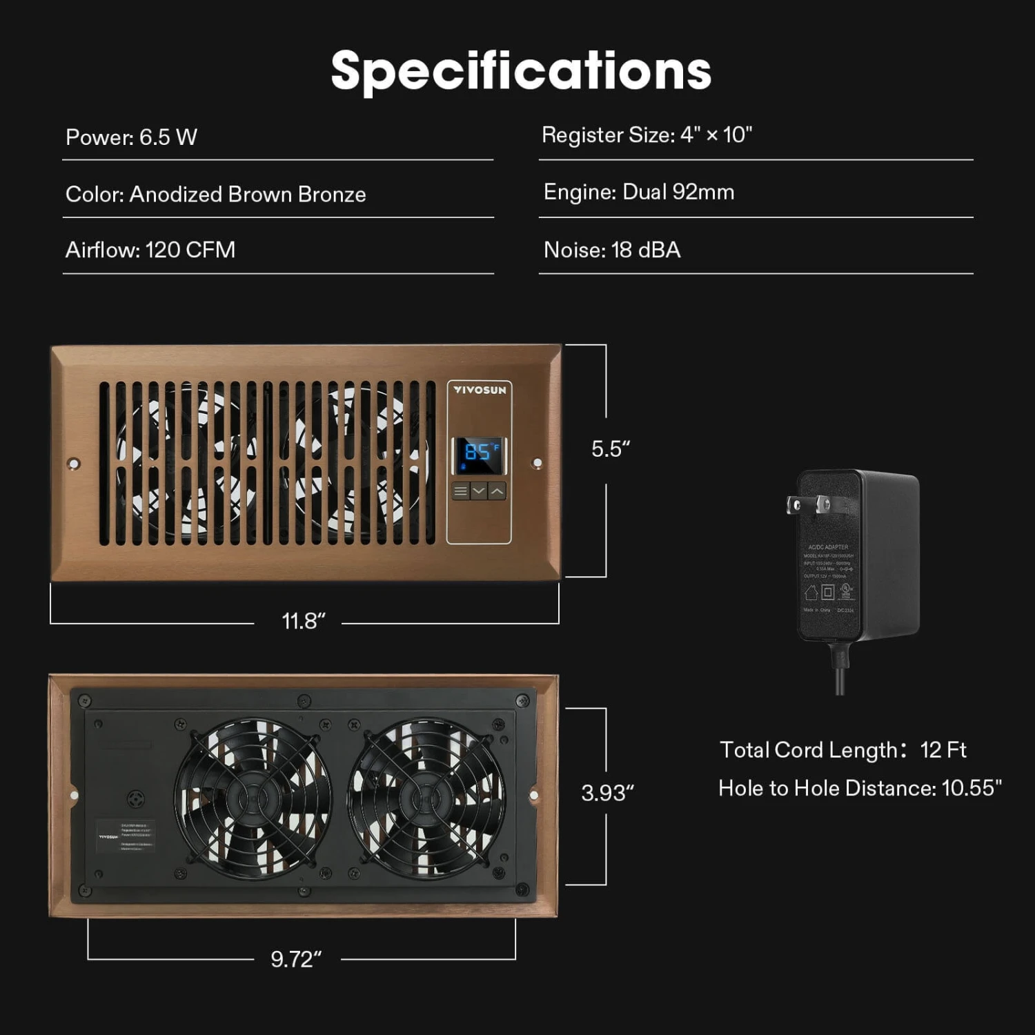 Quiet Register Booster Fan 4”×10”, Cooling Heating AC Vent Booster Fan, White